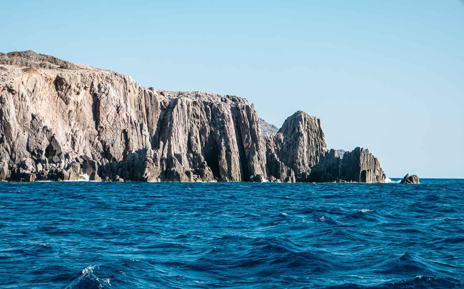 Soon we come to the island of Polyaigos, off the east coast of Milos, all pink rock and jagged outcrops,