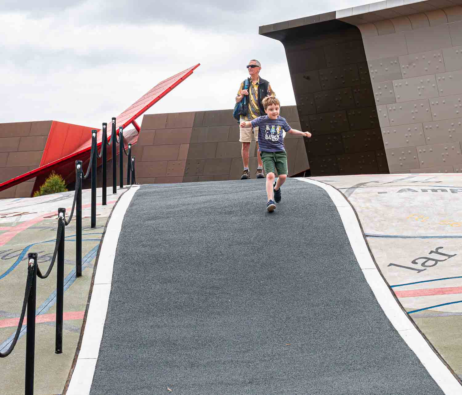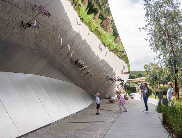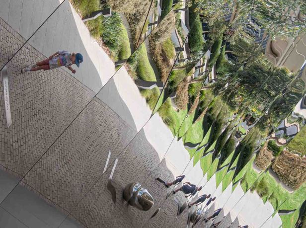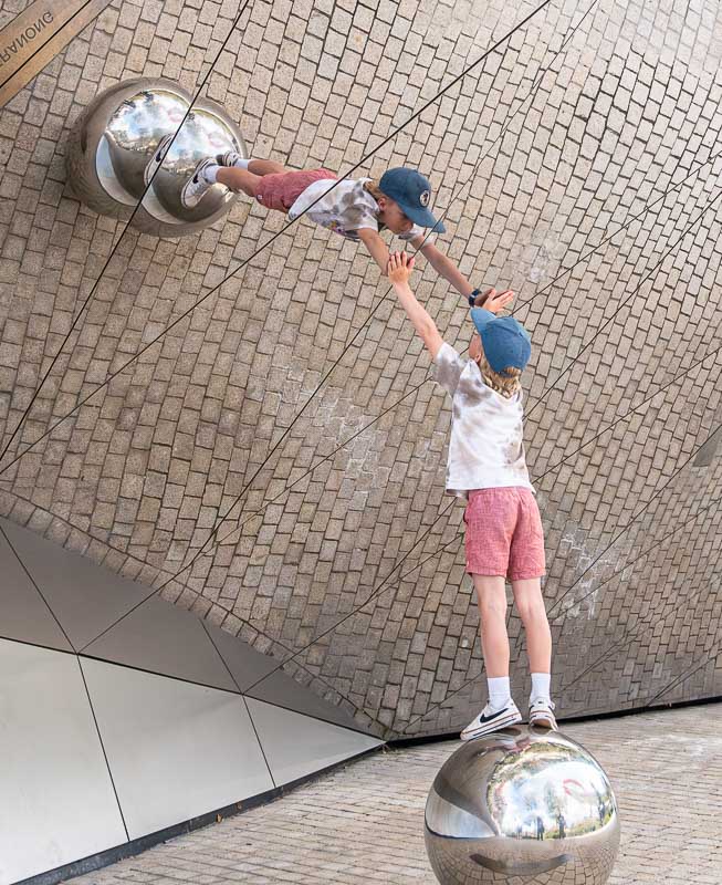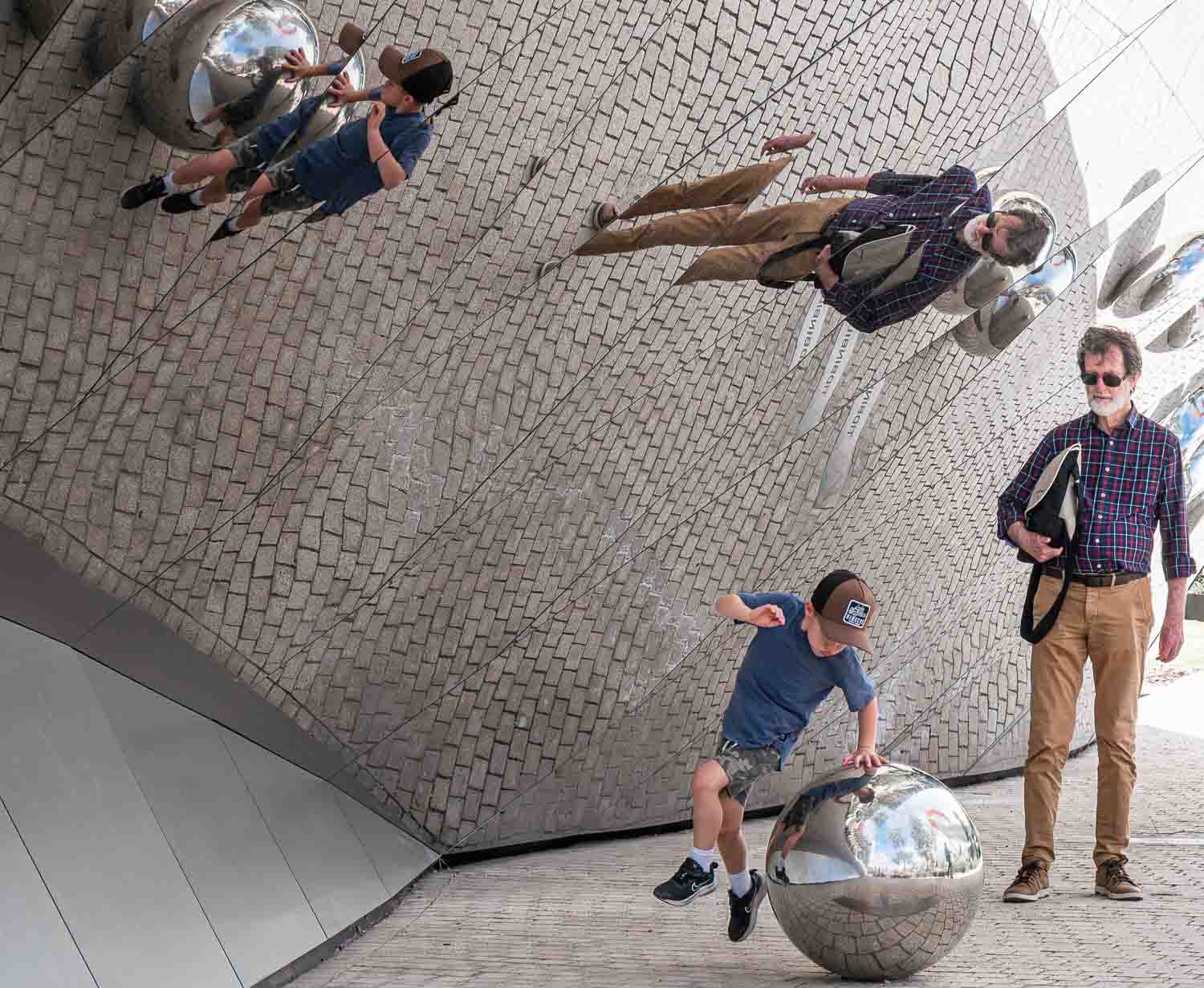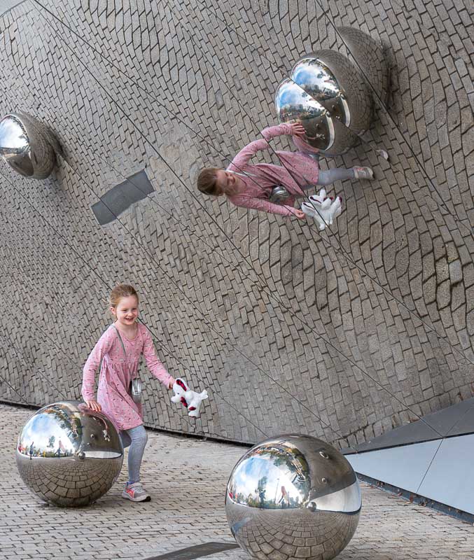 Long, curving and undulating, patterned pavement and a bulging segmented mirrored wall together creating a continuous game of hide and seek. Each reflection distorted, multiplied, until it’s almost impossible to tell where you’ll show up on the wall, or if, or how many times, or how high. Kids are delighted of course. Parents wait patiently knowing it’s impossible to leave until the children are ready. Even us adults are captivated. What a creation! It’s a funhouse mirror, greatly expanded and out in the open, an unexpected and magical play-land.