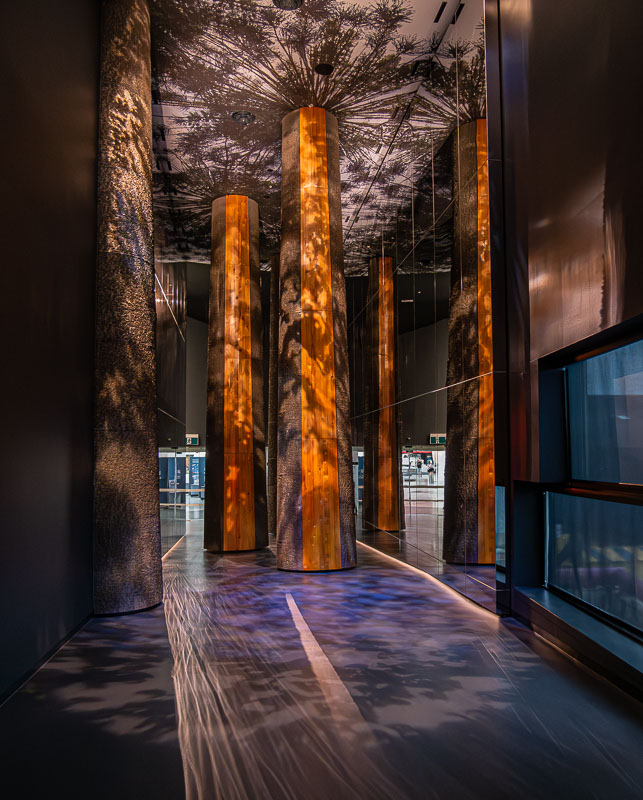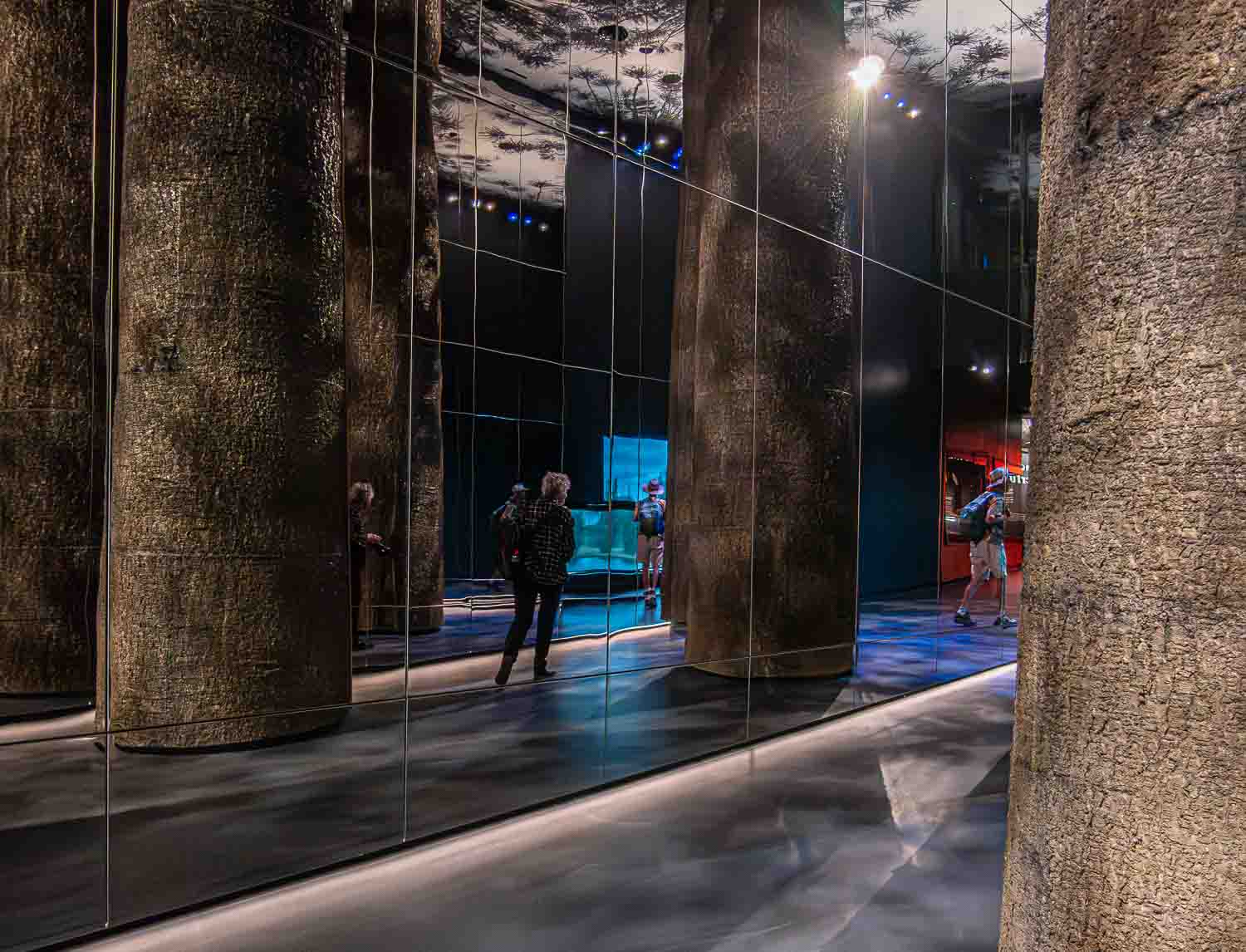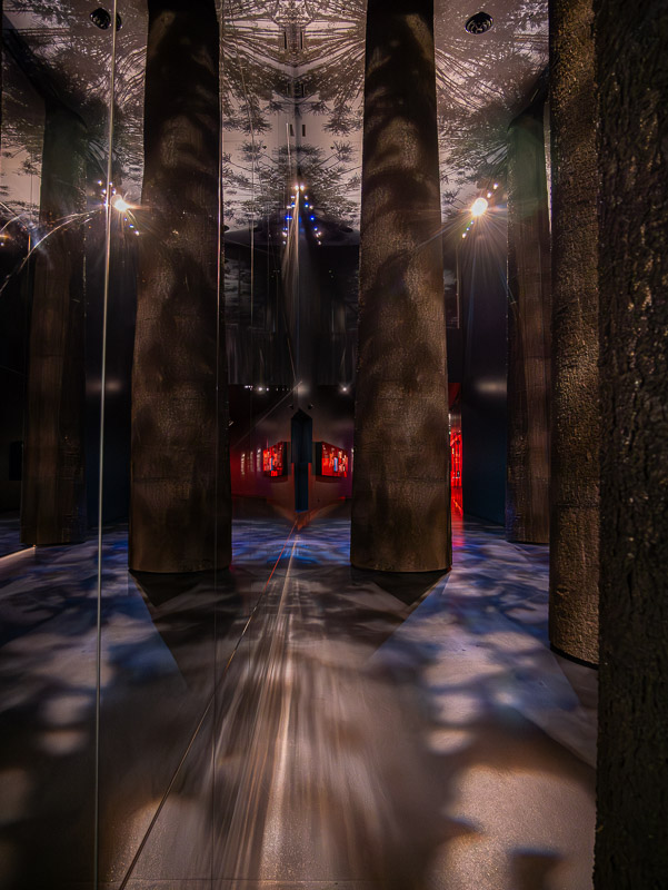 It is a layered and complex design. Beyond this huge entrance hall we walk through a mirrored forest that is at once unexpected and breathtaking.