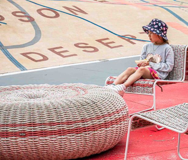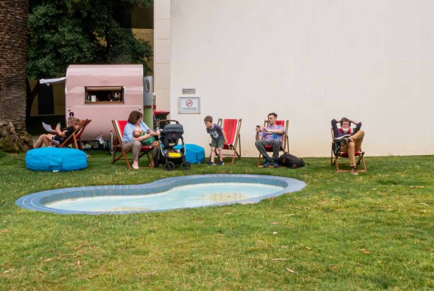 This courtyard “garden” symbolises perfectly the stark reality of an arid, treeless country with a narrow strip of green at the edge. At one end is a small grassy area, where a family rests by the 1950’s inspired coffee caravan, in typical canvas sling chairs, with the inevitable pool typical of the outdoor life of most Australians.