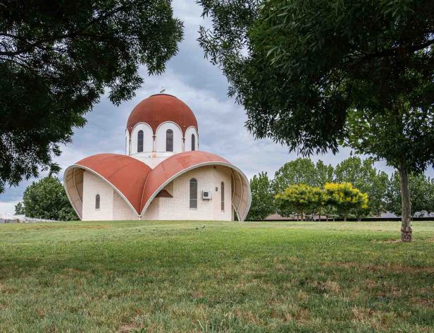 With time though things improve. Fencing. Landscaping (well lawn anyway). The trees grow. A sign appears out front in both Macedonian (Cyrillic) and English: Macedonian Orthodox Church St. Kliment of Ohrid. There are Macedonians in Canberra? Who knew? Though I don’t know why it should surprise me. At my high school there were students from 29 different countries.