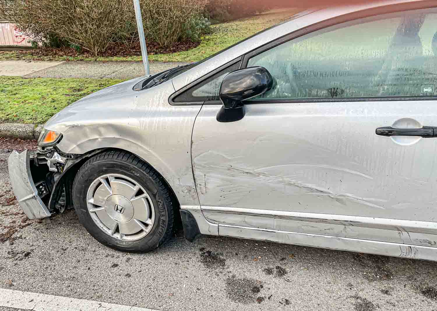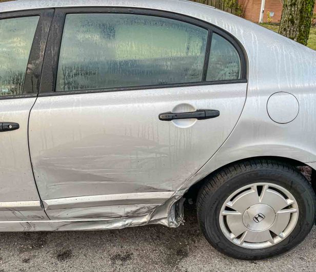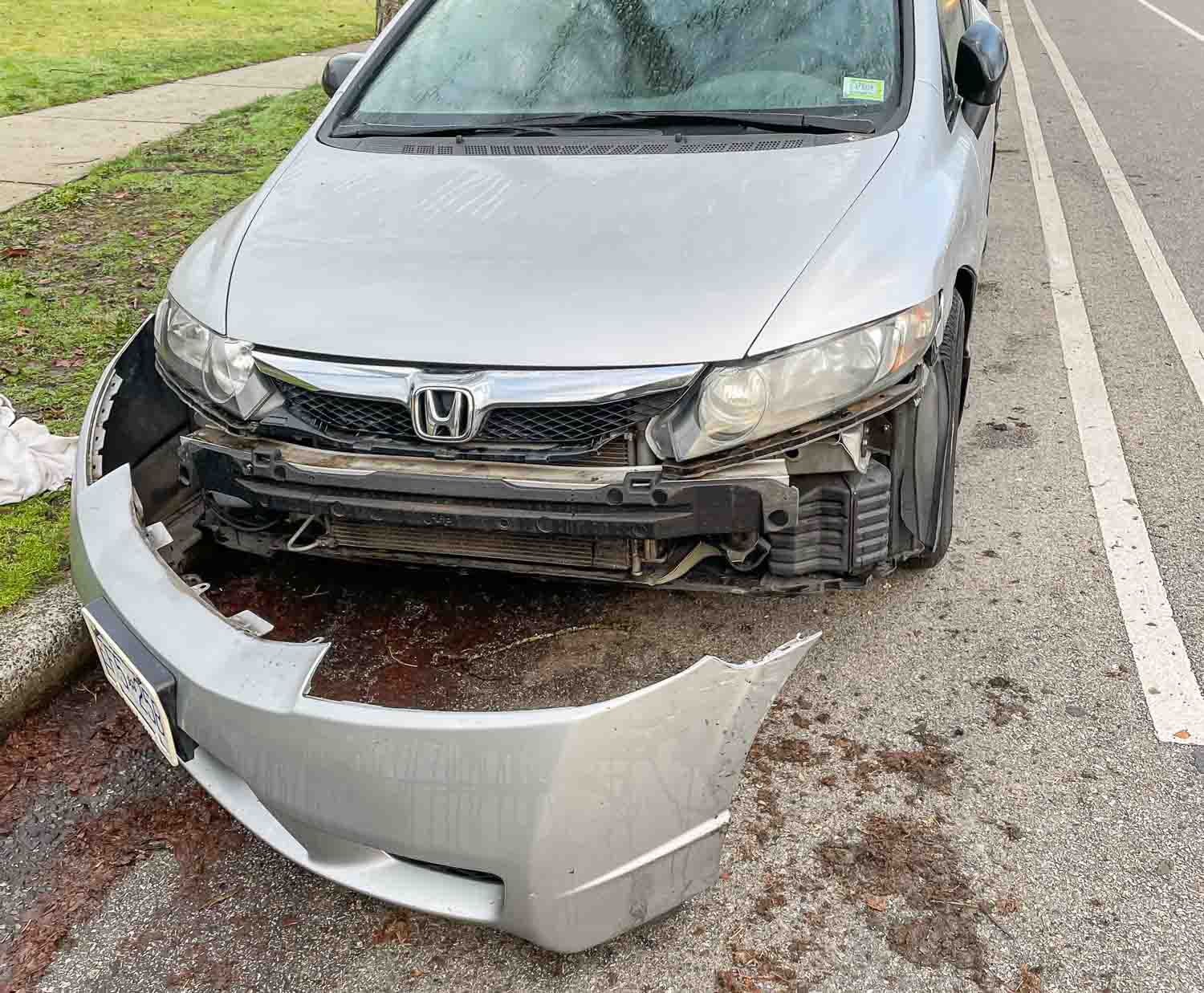At about 9.30 in the morning I come outside and walk to the car where it is parked in front of our building. I can hardly take in what I’m seeing. The front bumper seems to be lying on the ground. The closer I get the worse it looks. The entire left side of the car has been sideswiped, ripping the bumper off in the process.
