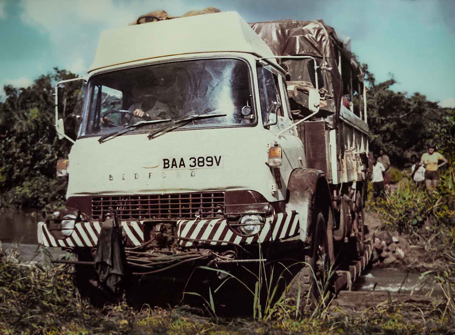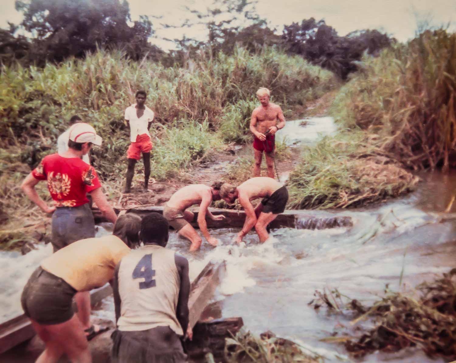 It’s the RSGs that save us; reinforced steel girders. We find four of them almost buried under months of fast growing tropical grasses, off to the side of the road. Without them we’d probably not have been able to build a bridge to get the truck over the river. Without them we’d have been well and truly hooped. But by now we’ve been through so much that looking at a river without a bridge is hardly enough to daunt us; we have become a tight-knit group, because we have to be, and work together to face challenges; even a river without a bridge.