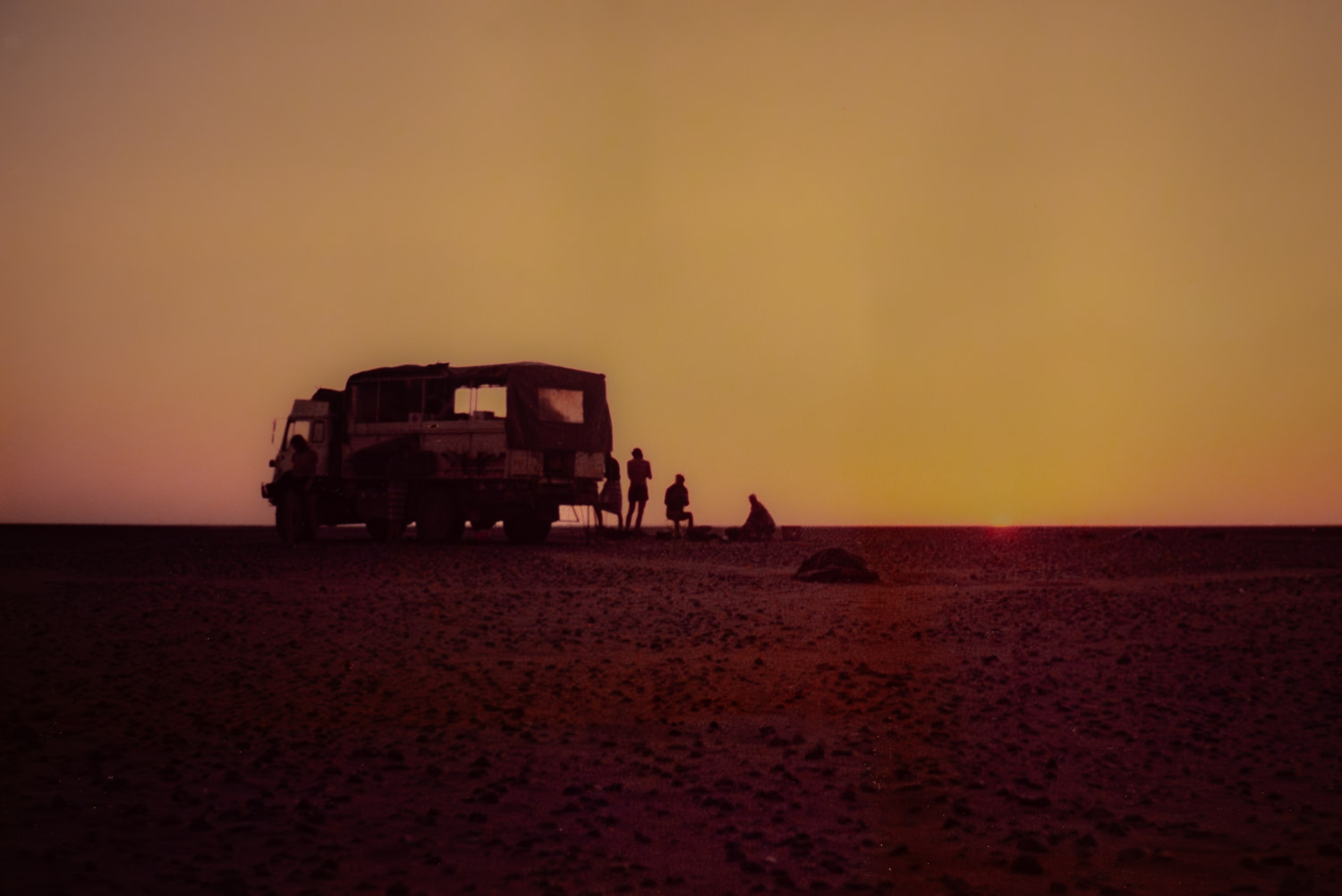 Two of the guys are carrying a sand mat, one at each end of it, and are running along one side of the truck. The same is happening on the other side. They’ve picked the mats up the second they were free of the rear tires and are running to quickly get them placed under the front tires before the truck sinks into the sand again. As soon as the mats are free of the front tires the mats are pulled from under the truck and placed under the rear tires. This dance goes on and on, with everyone who’s able taking turns. In this way we make slow progress, sometimes to get going only to be stuck again ten metres later. Not all of the Sahara is like this, this soft deep yielding sand that would stop the truck in its tracks, if there were any tracks, but good long stretches of it are. The sand mats, or traction mats, save us every time. That, and our exertions to keep getting them into place as the truck rolls slowly forward.