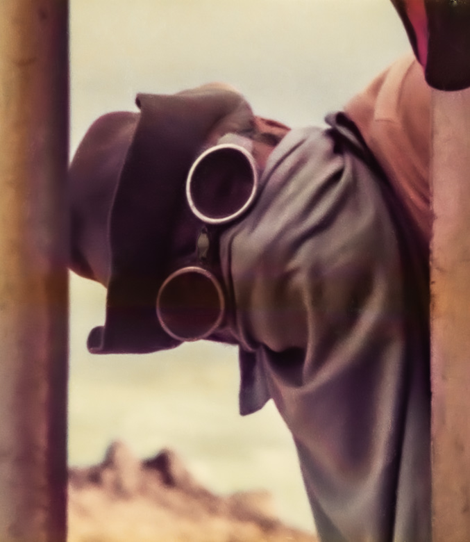 The sand swirling from the movement of the truck, or from the desert wind settles on and in everything. We understand why the Tuareg nomads dress as they do, wrapped from head to foot against the heat and the dust. Eric, riding on top of the truck, devises his own protection.